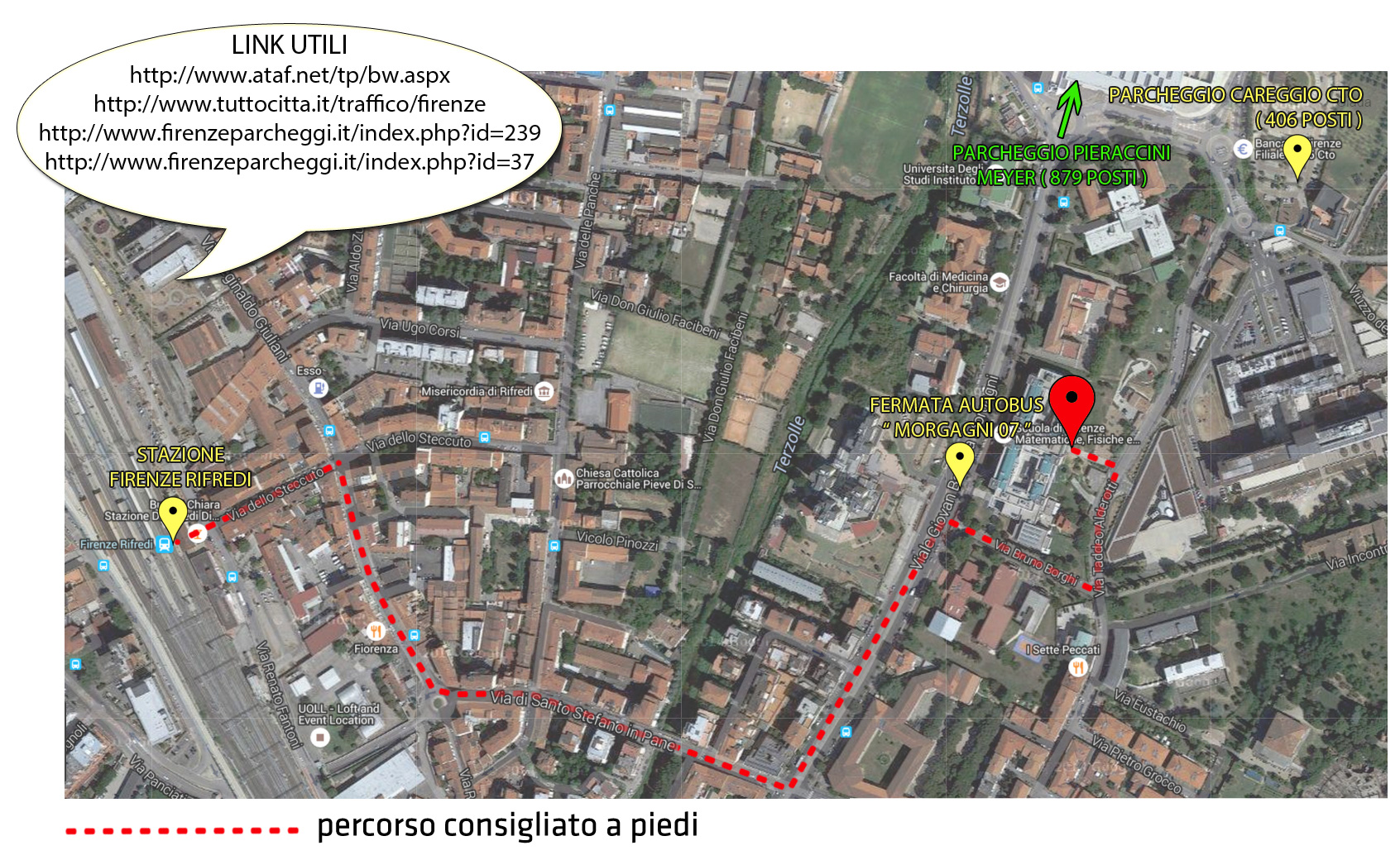 - dalla stazione FS di Firenze-Rifredi: a piedi in circa dieci minuti per il seguente itinerario: via S. Stefano in Pane, via Del Garbo, viale Morgagni, via T. Alderotti,;